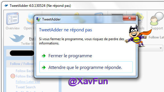 Depuis que TweetAdder 4 est sortie, de nombreuses personnes semblent avoir des problèmes avec des plantages du logiciel, soit lors de l’utilisation de la fonction « Follow Later List » ou de recherche de followers ou même pour certains sans rien faire !