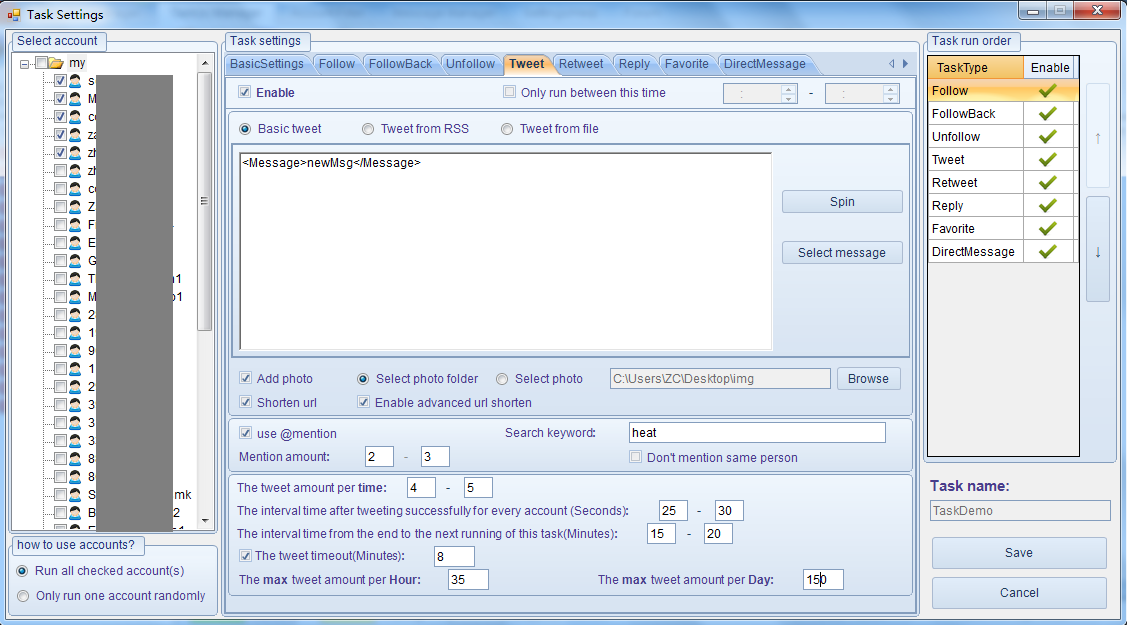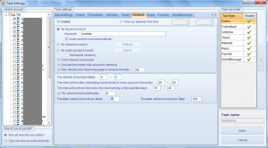Vous pouvez définir un message de Tweet pour l’ensemble de la tâche ou le définir pour tout les comptes, vous pouvez également utiliser l’API SpinnerChief pour spinner vos tweets automatiquement, ainsi vous n’aurez pas de « duplicate message » envoyé. La tâche de tweet peut être stoppé automatiquement avec avoir été fait une fois, ou continuez selon vos paramètres. La meilleur partie de vos tâches est utiliser la fonction utilisez « @mention » dans vos tweets ; le programme va chercher des gens automatiquement en se basant sur vos mots clés, ainsi les gens qui recevront vos messages même si ils ne vous suivent pas.